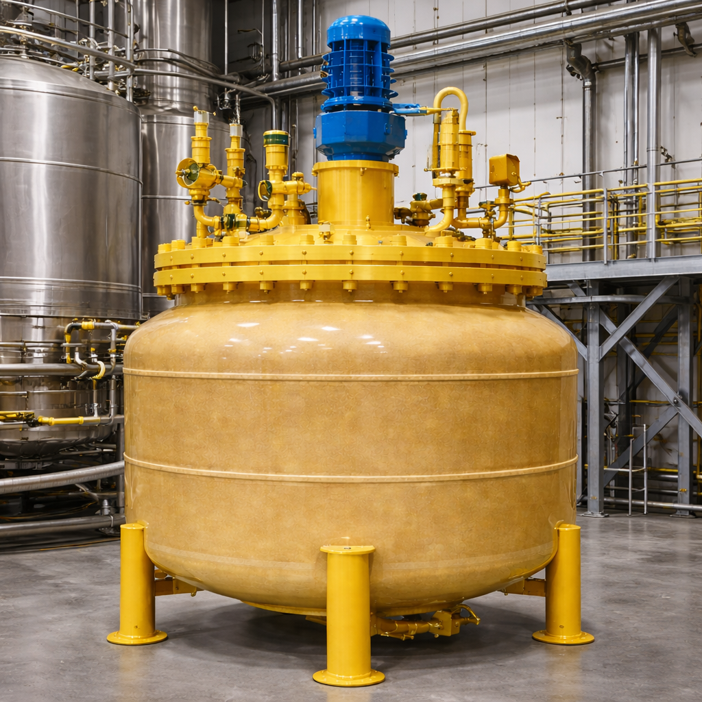 Os reatores químicos são fabricados utilizando PRFV de alta performance, composto por fibras de vidro impregnadas com resinas poliméricas selecionadas conforme a aplicação. Resinas isoftálicas são aplicadas em meios corrosivos moderados, enquanto resinas éster vinílicas como Derakane 470-300 e 411-350 são especificadas para ambientes altamente agressivos.