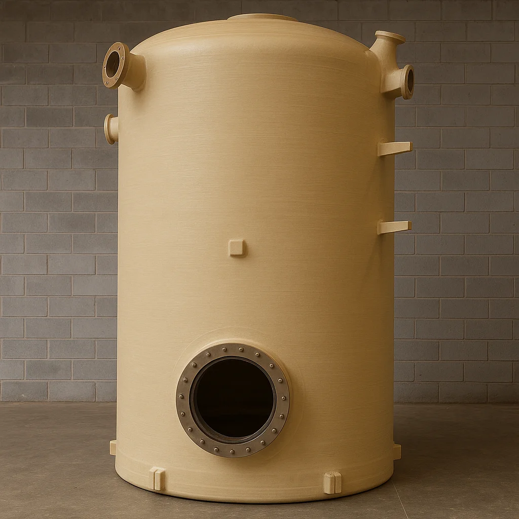 A estrutura é composta por camadas de fibra de vidro e resina viniléster, que proporcionam impermeabilidade total e resistência à degradação química causada por ácidos concentrados. O formato cilíndrico distribui uniformemente as pressões internas e reduz tensões estruturais, assegurando durabilidade e estabilidade.