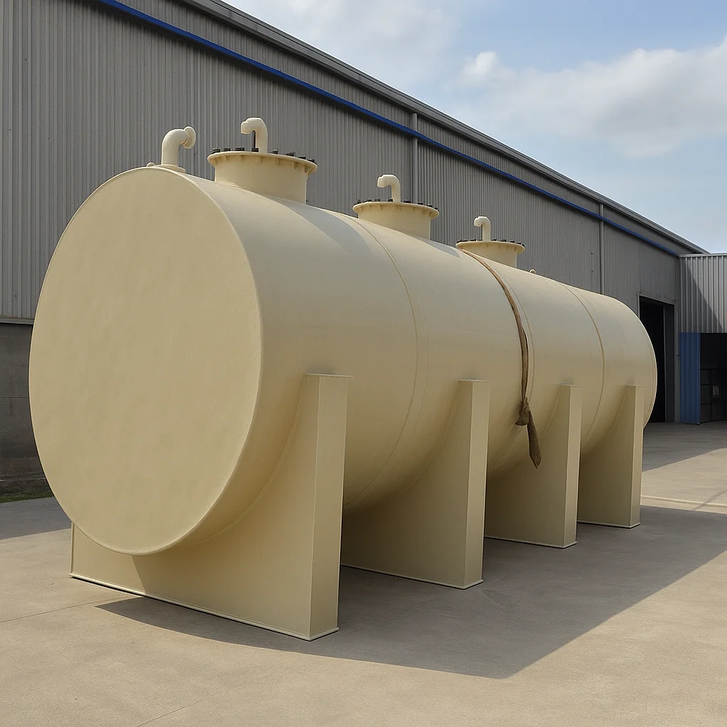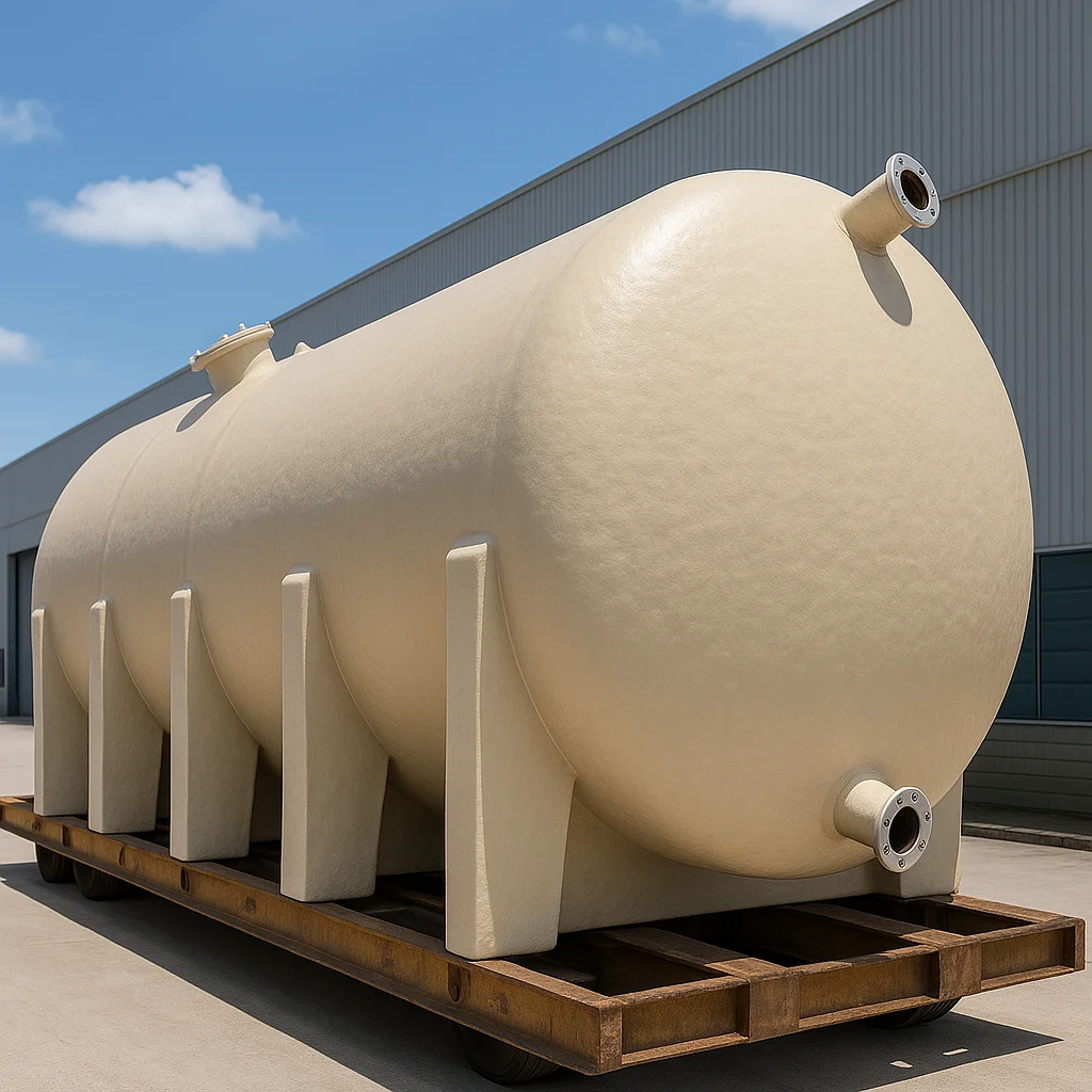Sua estrutura em PRFV, composta por camadas de fibra de vidro e resina termofixa, proporciona rigidez, impermeabilidade e resistência química, assegurando operação segura mesmo sob condições severas. O formato cilíndrico favorece a distribuição uniforme das cargas hidrostáticas, reduzindo tensões estruturais e aumentando a durabilidade do equipamento.