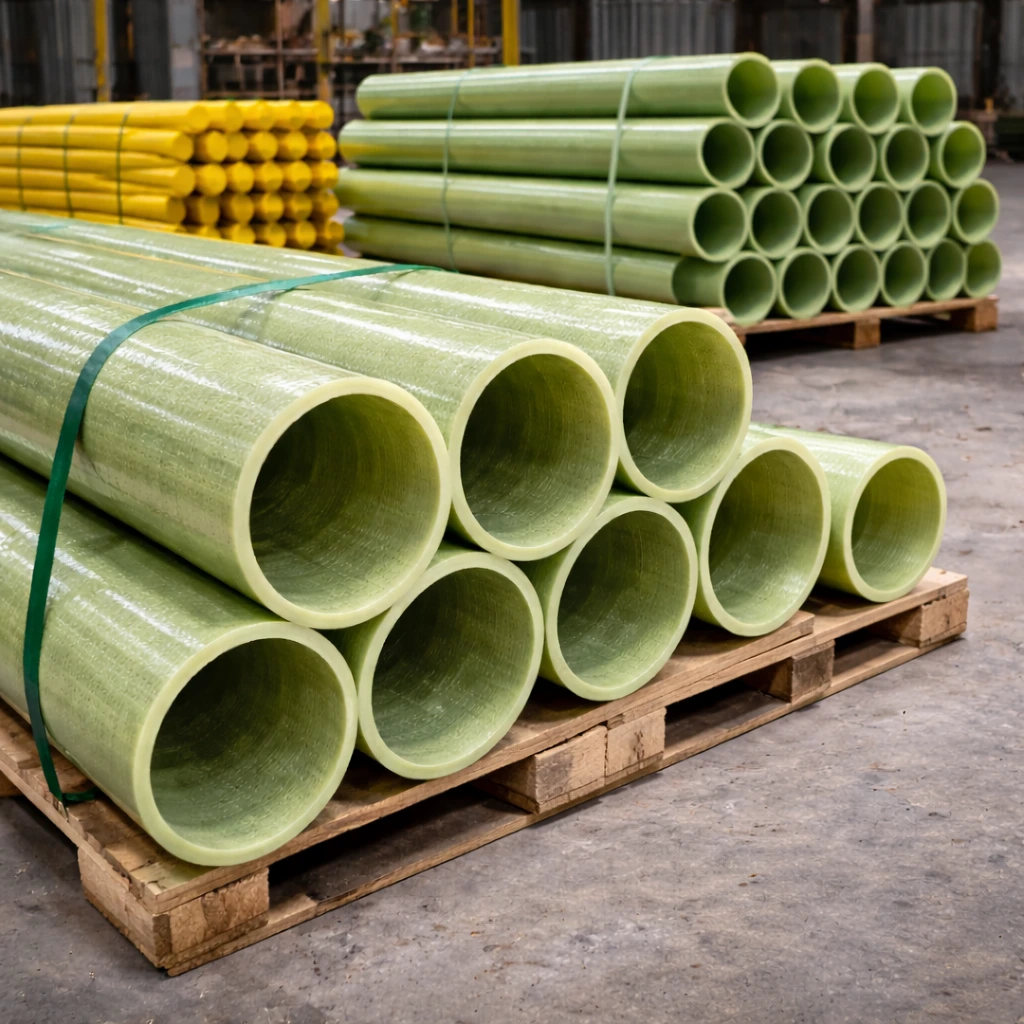 Os tubos PRFV são fabricados utilizando processos de laminação manual (hand lay-up) conforme norma NBS PS 15-69 ou enrolamento filamentar (filament winding) conforme norma ASTM D-2996. A estrutura é composta por camadas de liner interno (barreira química), reforço estrutural com fibras de vidro e resina, e proteção externa.